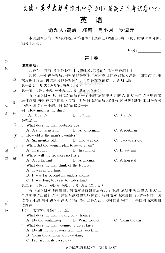 【英語(yǔ)】炎德英才大聯(lián)考2017雅禮中學(xué)高三4次月考
