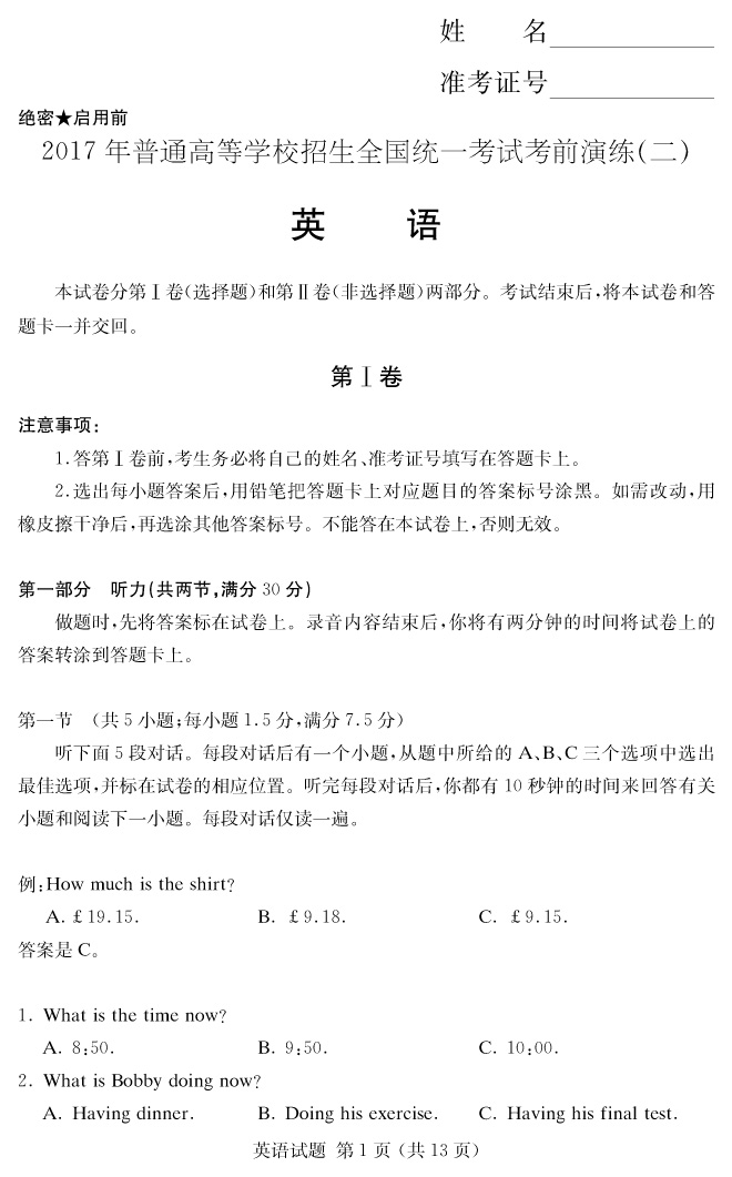 【英語】2017年普通高等學(xué)校招生全國統(tǒng)一考試考前演練(二)