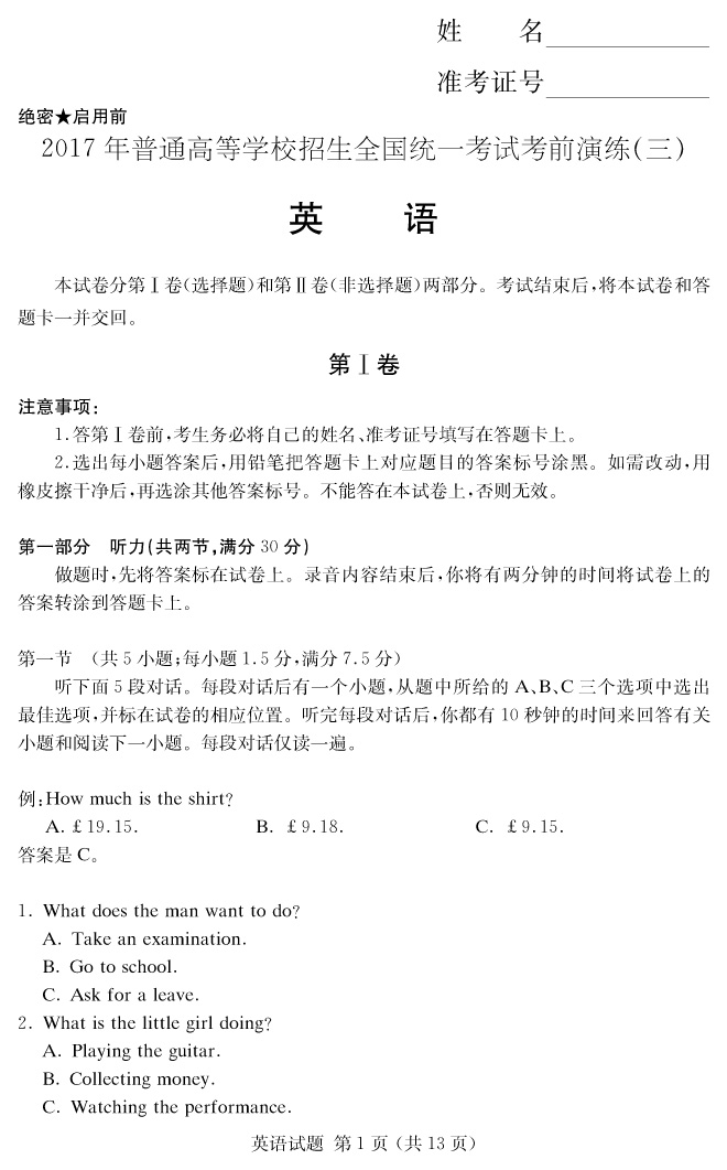 下一篇:【語文】2017年普通高等學校招生全國統一考試考前演練(三)