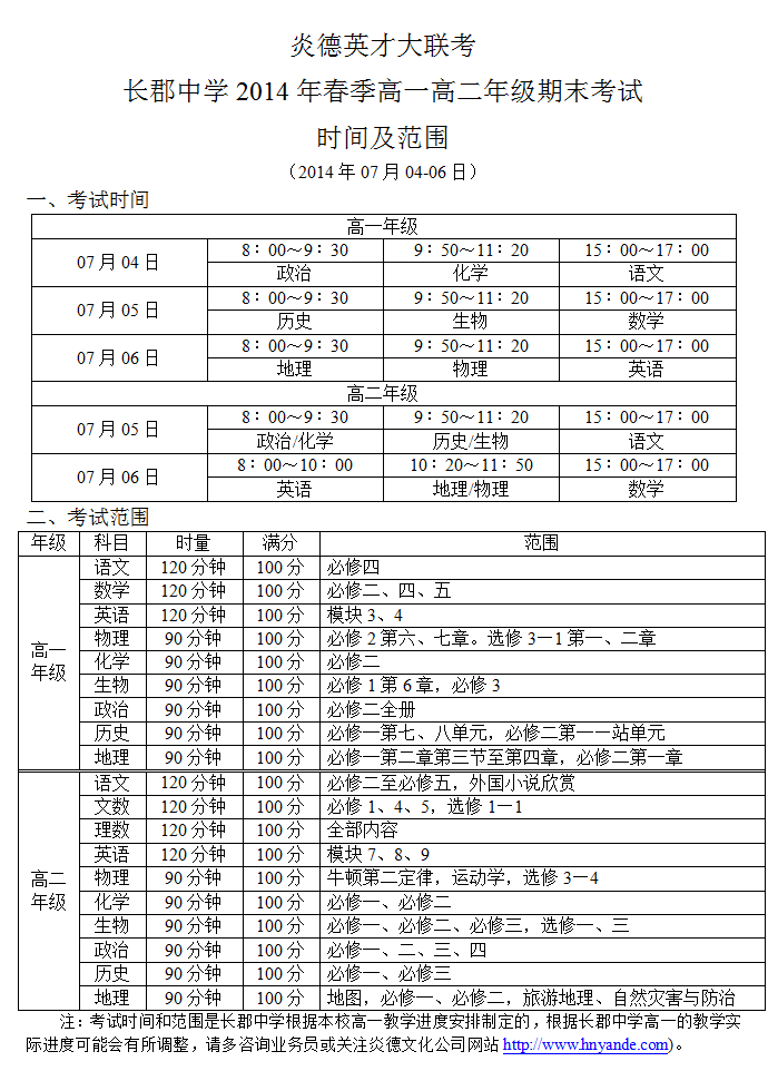 2014年春季長(zhǎng)郡中學(xué)高一高二期末考試考試時(shí)間及范圍(2014.07.04-06)