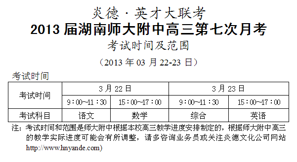 炎德英才大聯考師大附中2013屆高三第七次月考考試時間和范圍