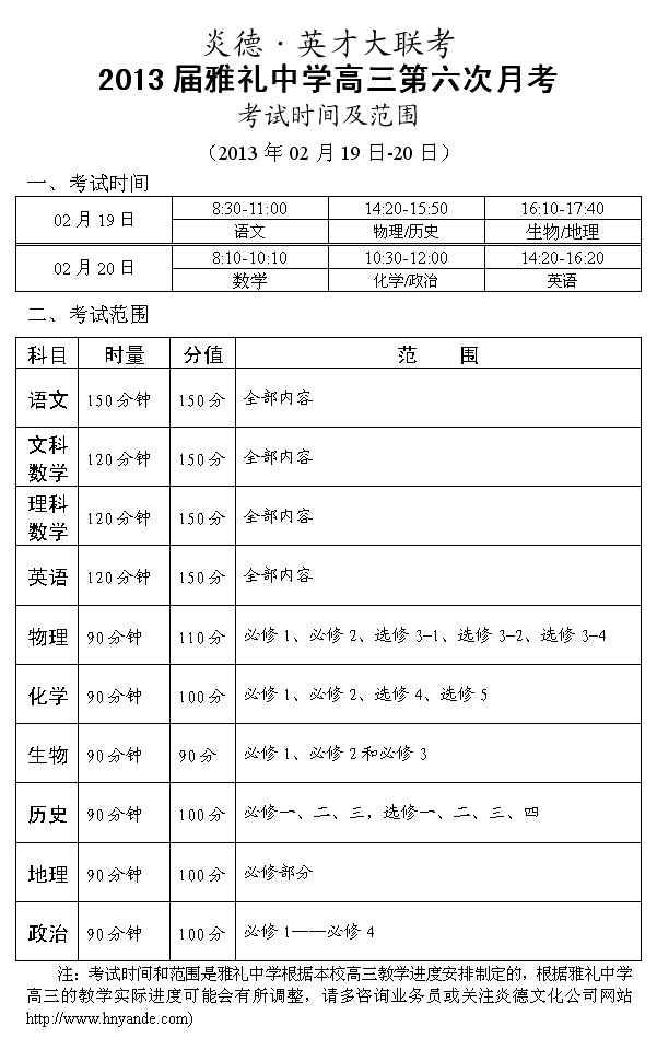 炎德英才大聯考雅禮中學2013屆高三第六次月考考試時間和范圍