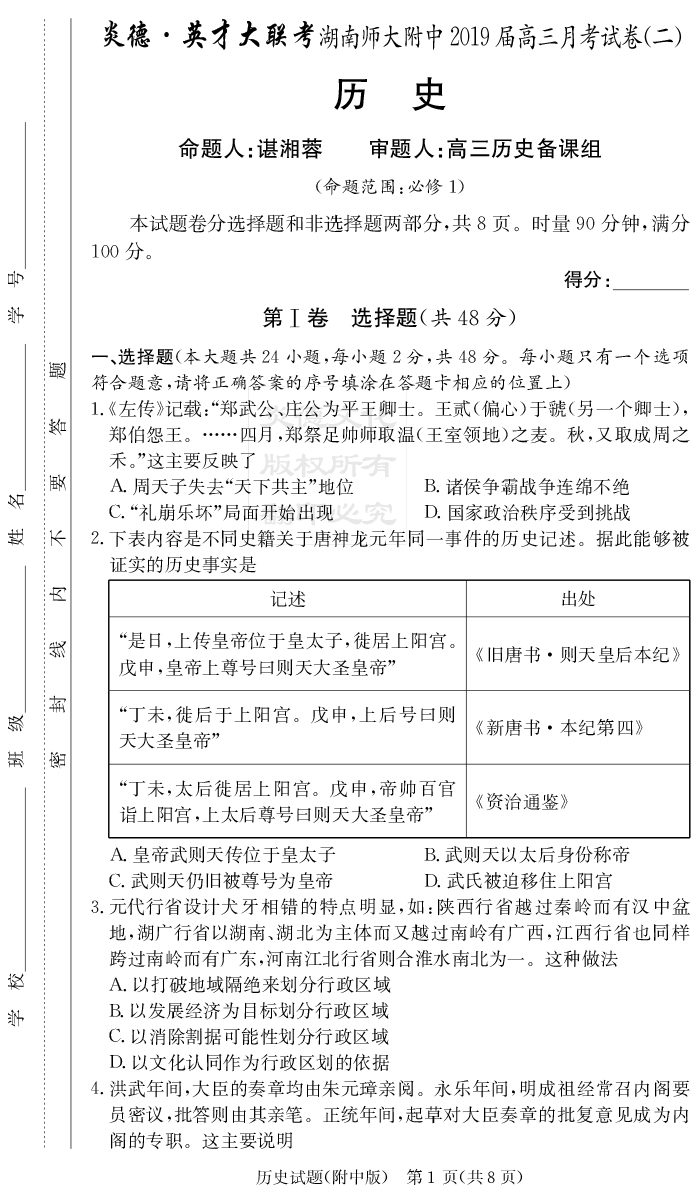2026湖南師大附中新高考考前小題訓練·歷史