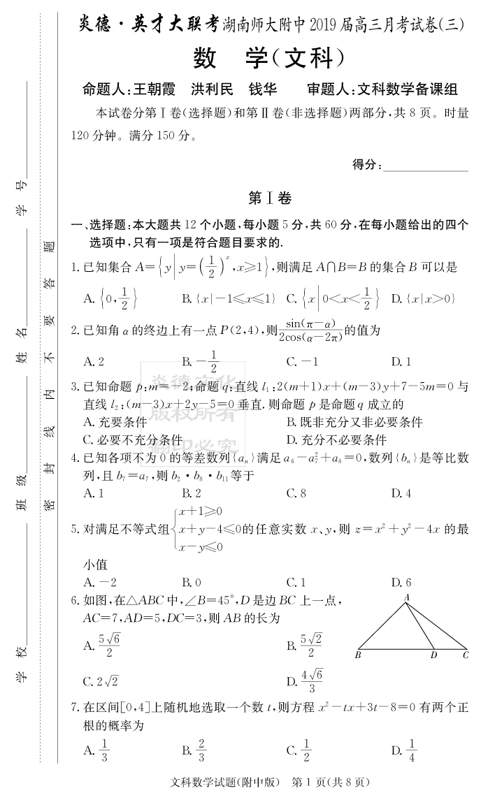 【文數(shù)】炎德英才大聯(lián)考2019師大附中高三3次月考