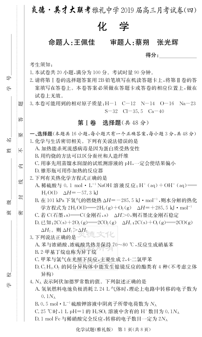 【化學(xué)】炎德英才大聯(lián)考2019雅禮中學(xué)高三4次月考