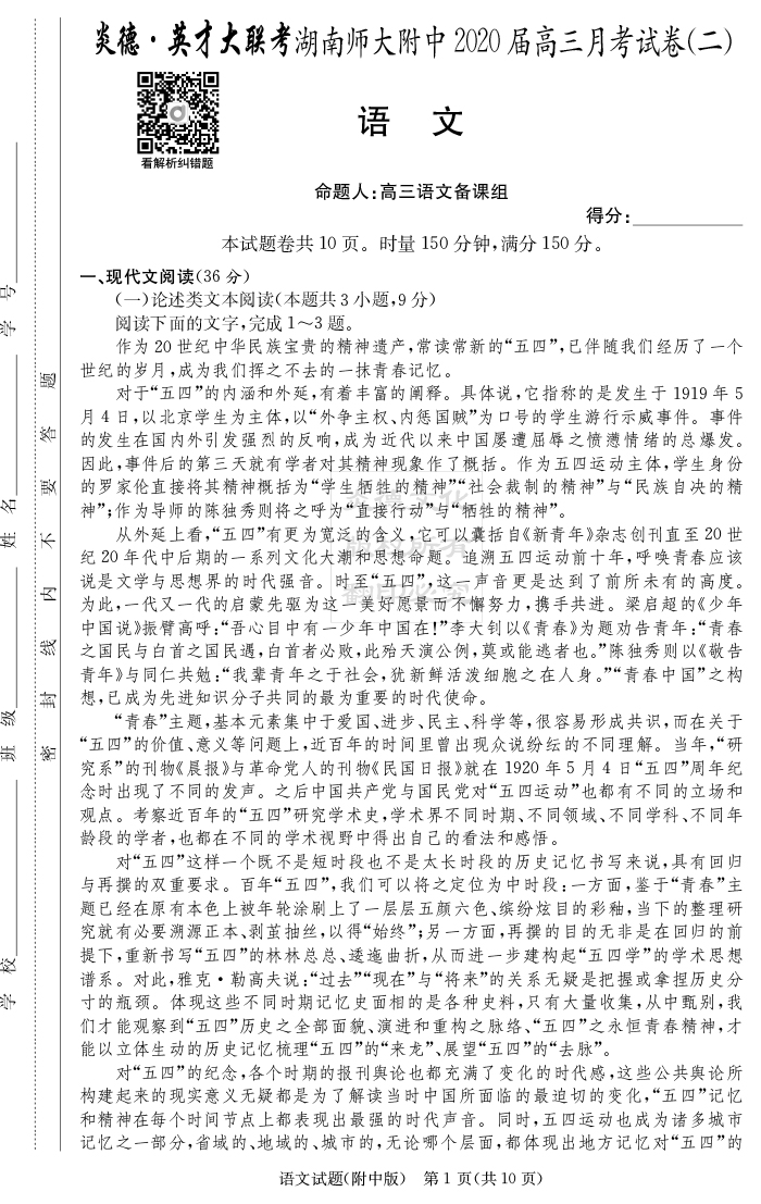2026湖南師大附中新高考考前小題訓練·語文