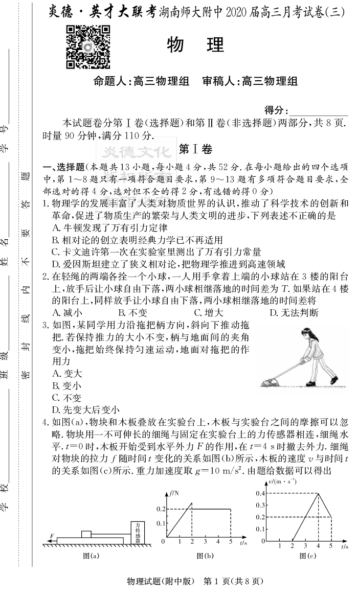 【物理】炎德英才大聯(lián)考2020屆師大附中高三3次月考