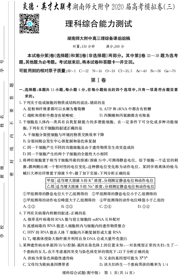 2026湖南師大附中新高考考前小題訓練·生物