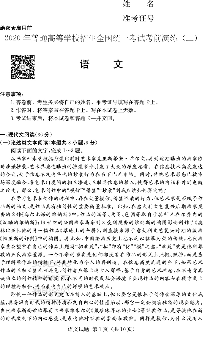 上一篇:【英語】2020年普通高等學校招生全國統一考試考前演練(二)