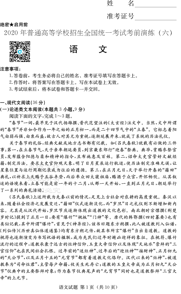 下一篇:【全科】2020年普通高等學校招生全國統一考試考前演練(一)