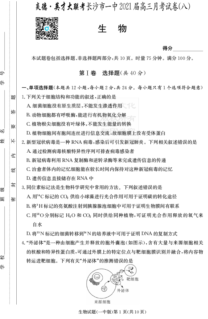 2026年高中寒假作業自主學習作業本·高三年級·生物
