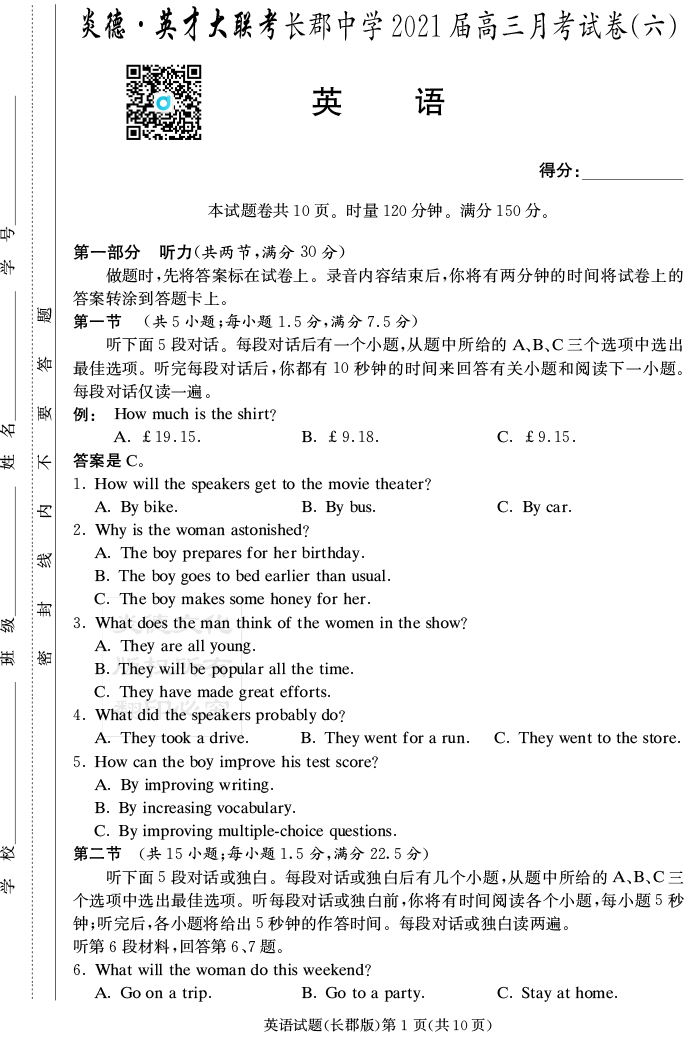 【英語】炎德英才大聯(lián)考2021屆長郡中學(xué)高三6次月考
