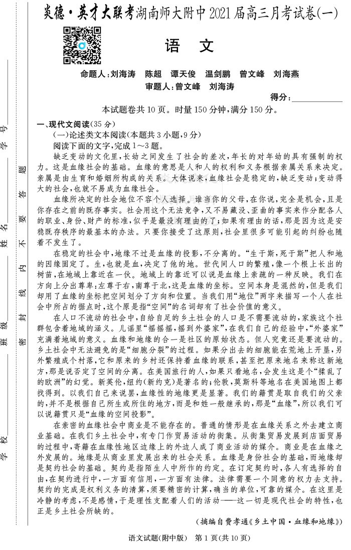2026湖南師大附中新高考考前小題訓練·語文