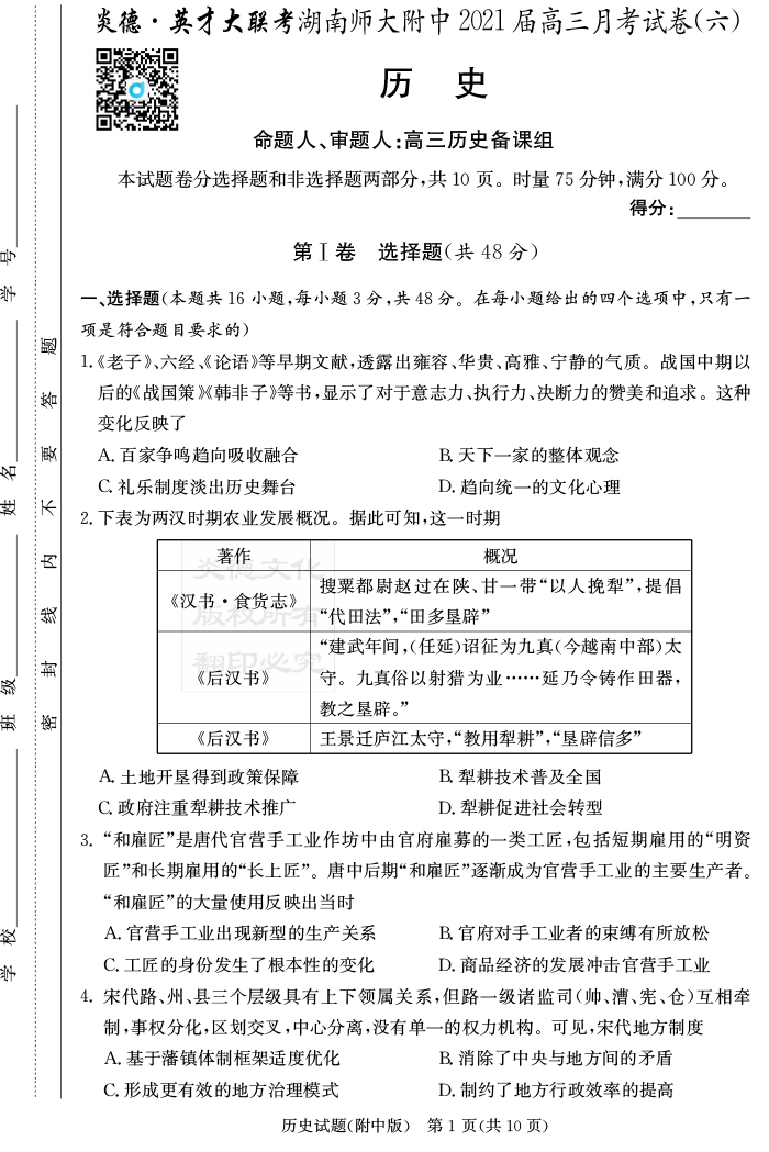 2026年高中寒假作業自主學習作業本·高三年級·歷史