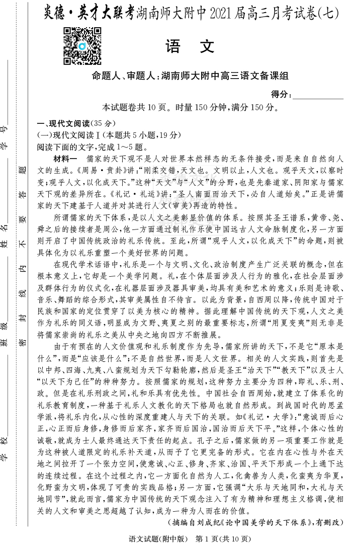 2026湖南師大附中新高考考前小題訓練·語文