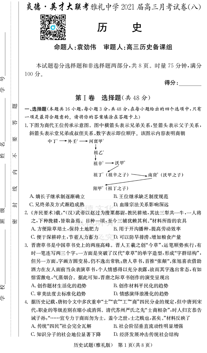 2026湖南師大附中新高考考前小題訓練·歷史