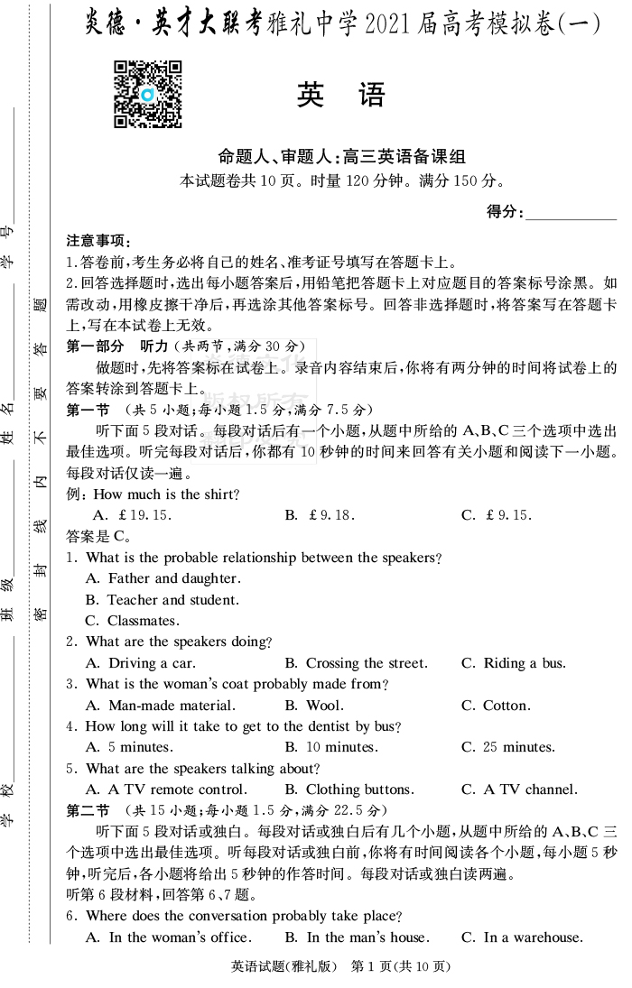 【英語(yǔ)】炎德英才大聯(lián)考2021屆雅禮中學(xué)高三9次月考(模擬一)