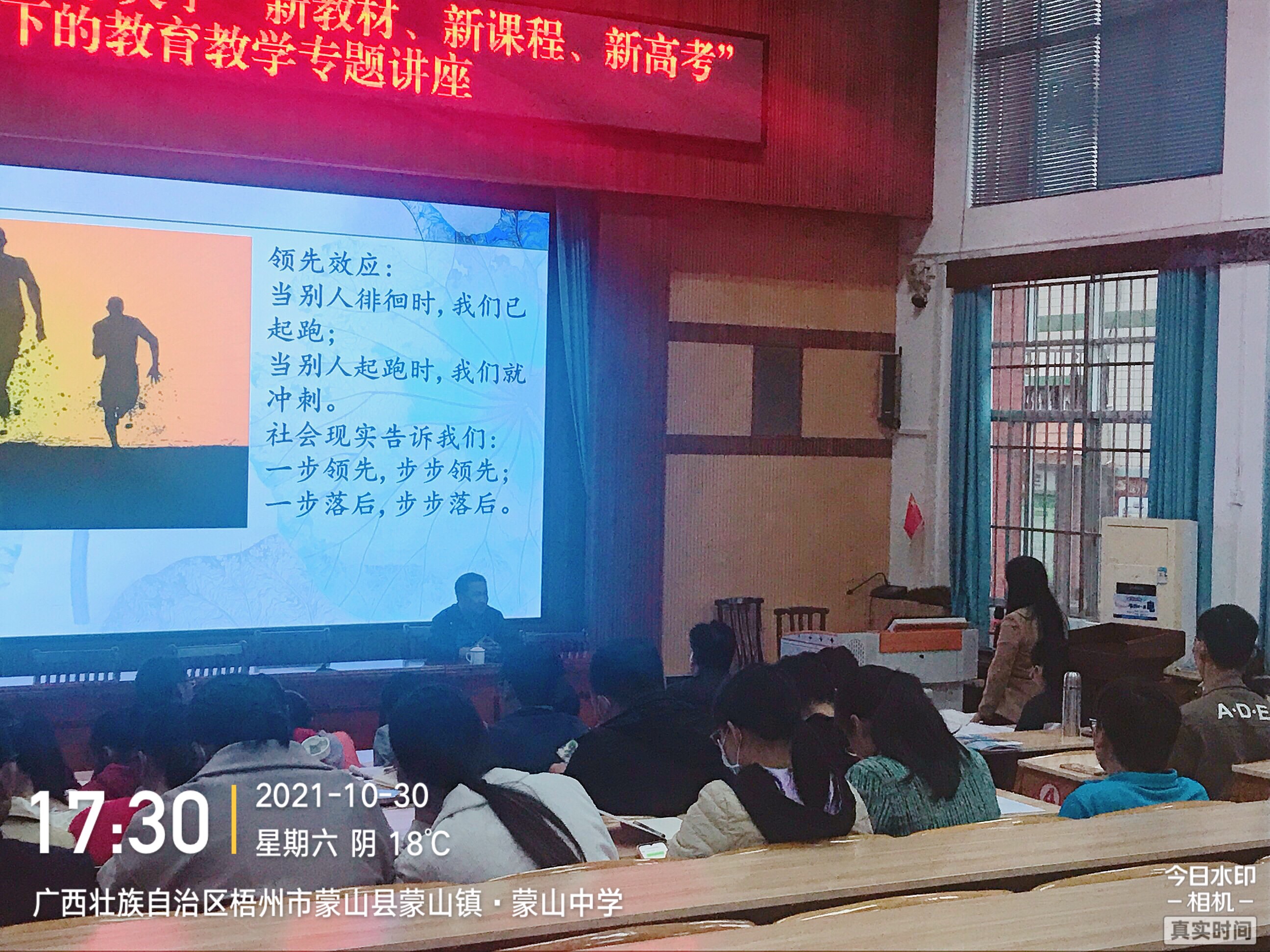 鹿寨中學全校80多名高一老師認真聽課,做筆記。