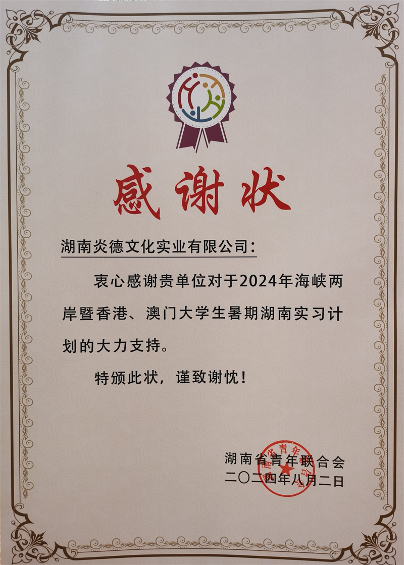 湖南炎德文化實業有限公司獲2024年港澳臺大學生暑期湖南實習計劃“感謝狀”