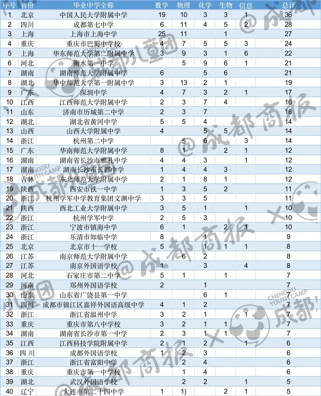 其中國集中學榜前三的競爭是比較強的,中國人民大學附屬中學以各學科總計15人位列第一,成都第七中學則僅以1人之差,以各學科總計14人位列第二,上海中學以各學科總計13人位列第三。