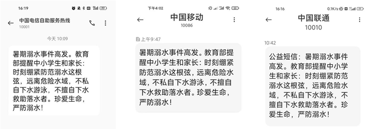 7月13日,教育部、工信部協調中國電信、中國移動、中國聯通三大運營商,向全國手機用戶發送了暑期防溺水公益短信。短信內容為:暑期溺水事件高發,教育部提醒中小學生和家長,時刻緊繃防范溺水這根弦,遠離危險水域,不私自下水游泳,不擅自下水救助落水者。珍愛生命,嚴防溺水!不少學生家長收到公益短信后表示,孩子安全大意不得,將會履行好監護職責,高度關注孩子暑期安全。