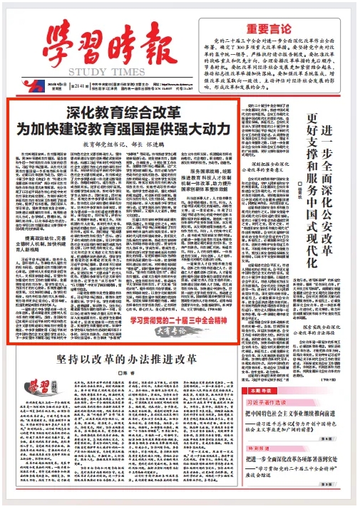 教育興則國家興,教育強則國家強。到2035年建成教育強國,是當前和今后一個時期教育改革發(fā)展的總目標。習近平總書記強調(diào),從教育大國到教育強國是一個系統(tǒng)性躍升和質(zhì)變,必須以改革創(chuàng)新為動力。黨的二十屆三中全會《決定》在“構(gòu)建支持全面創(chuàng)新體制機制”部分對深化教育綜合改革作出重大決策部署,充分體現(xiàn)了以習近平同志為核心的黨中央對教育事業(yè)的高度重視,為做好新時代新征程教育改革發(fā)展工作指明了前進方向、提供了根本遵循。我們要深入學習領(lǐng)會、堅決貫徹落實全會精神,加快建設(shè)高質(zhì)量教育體系,統(tǒng)籌推進育人方式、辦學模式、管理體制、保障機制改革,以改革添動力增活力,奮力書寫以教育強國建設(shè)支撐引領(lǐng)中國式現(xiàn)代化的新篇章。